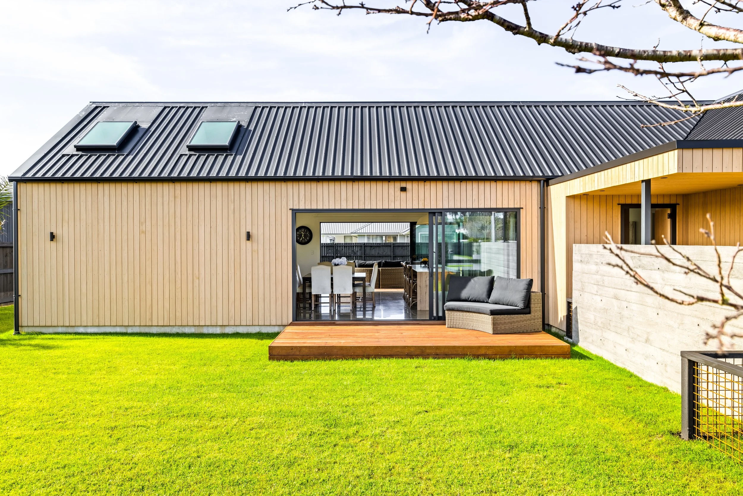 At 224m², the home feels expansive yet warm. Scissor trusses throughout the main living and dining zones creating space, while the T-shape helps separate bedrooms from shared spaces for a functional family flow. Wide decking and large sliding doors invite indoor-outdoor living, perfect for long summer afternoons.
